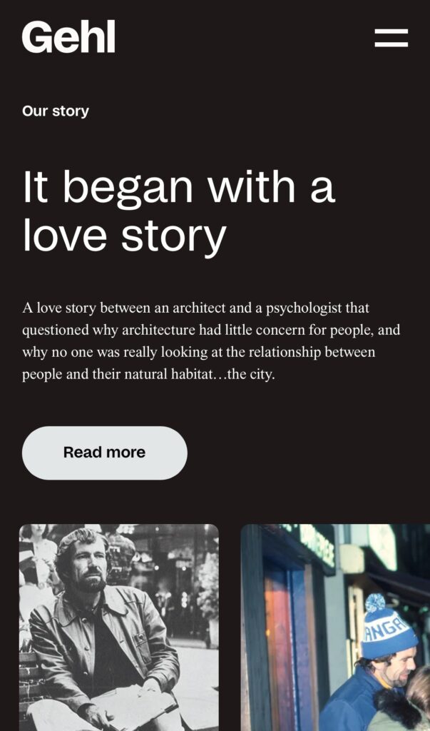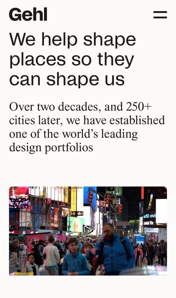 Sitet indeholder en global oversigt, der fremhæver de mere end 250 byer, Gehl har arbejdet i, animationer der fremhæver projekternes indflydelse, samt en interaktiv projekt- og teamoversigt, der gør navigationen enkel. Websitet afspejler Gehls arbejde, værdier og tilgang til at designe byer, som prioriterer livskvalitet og planetens trivsel.